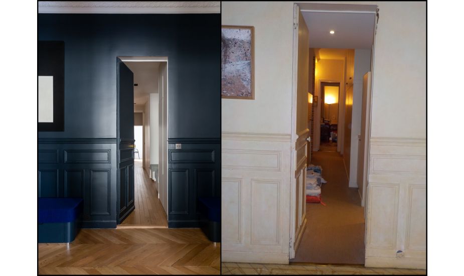 Enfin, un travail subtil sur la couleur et les luminaires vient accompagner les œuvres d’art et le nouveau mobilier design des propriétaires. Dans l’entrée, un bleu sombre crée un bel effet, l’éclairage est dirigé vers les tableaux (photo 6). En contraste, le salon et la salle à manger sont d’un blanc lumineux, jusqu’aux rideaux, mettant en valeur les moulures du plafond, le marbre noir des tables et les chaises (photos 1, 3 et 5). Les grandes suspensions sont choisies pour dialoguer avec les œuvres. Même changement d’ambiance entre l’entrée et le couloir, on passe de l’ombre à la lumière, tout en signifiant que l’on pénètre dans une autre zone de l’appartement (photo 7). Au final, avec une palette de couleurs réduite, bleu sombre, noir et blanc, sur une base de chêne clair, l’appartement a gagné en douceur et en épure.
