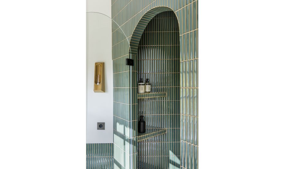 Des étagères maçonnées ont été intégrées dans l’épaisseur des murs pour offrir du rangement sans empiéter sur le volume. Les faïences kitkat, posées verticalement, accompagnent le dessin de la porte et des niches, accentuant la hauteur et les lignes architecturales.