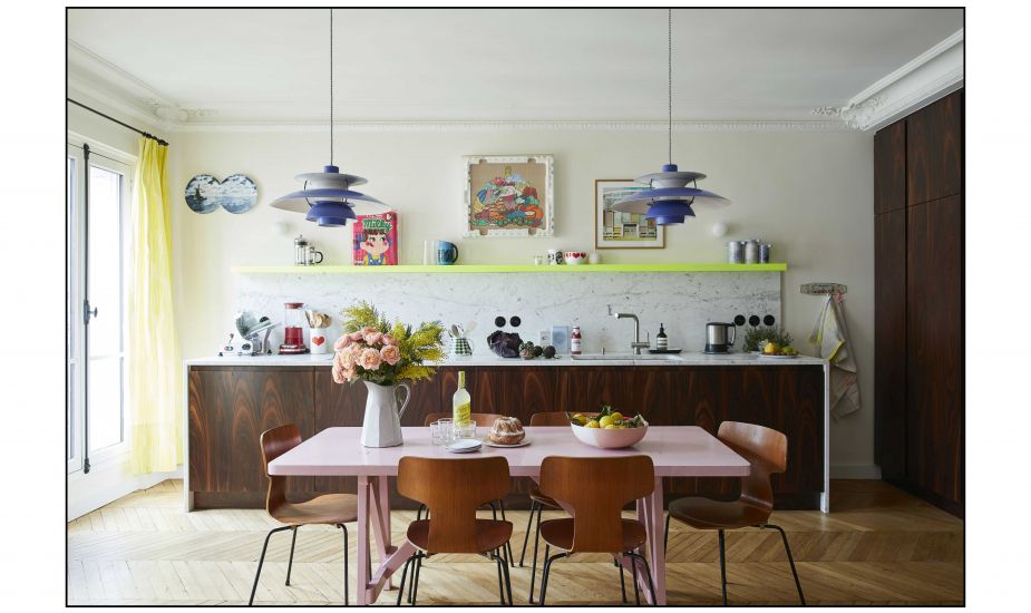 Dans cet appartement des Grands Boulevards, chers à Haussmann, la cuisine occupe la moitié du double salon. Rien de classique dans sa disposition, puisqu’elle prend la forme d’un comptoir d’apparat, qui se fond dans l’ancienne salle à manger. L’emploi du marbre et du bois précieux, traités ici en aplats, contrastent avec les touches de couleurs vives et les motifs pop, tout à fait contemporains. La partie technique est dissimulée dans de grands placards. (Photo 1) Projet Grands Boulevards 2.