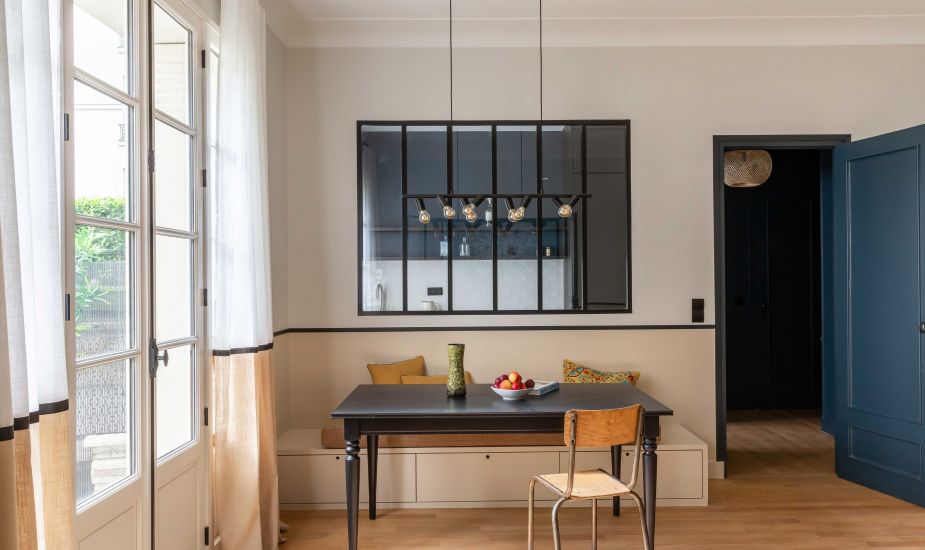 Les cloisons vitrées sont une excellente alternative : elles permettent de créer une séparation tout en laissant passer la lumière, agrandissant ainsi visuellement l’espace. Cette solution offre une sensation de volume et de légèreté, idéale dans les petits appartements. (Photo 1 Projet Scheffer).