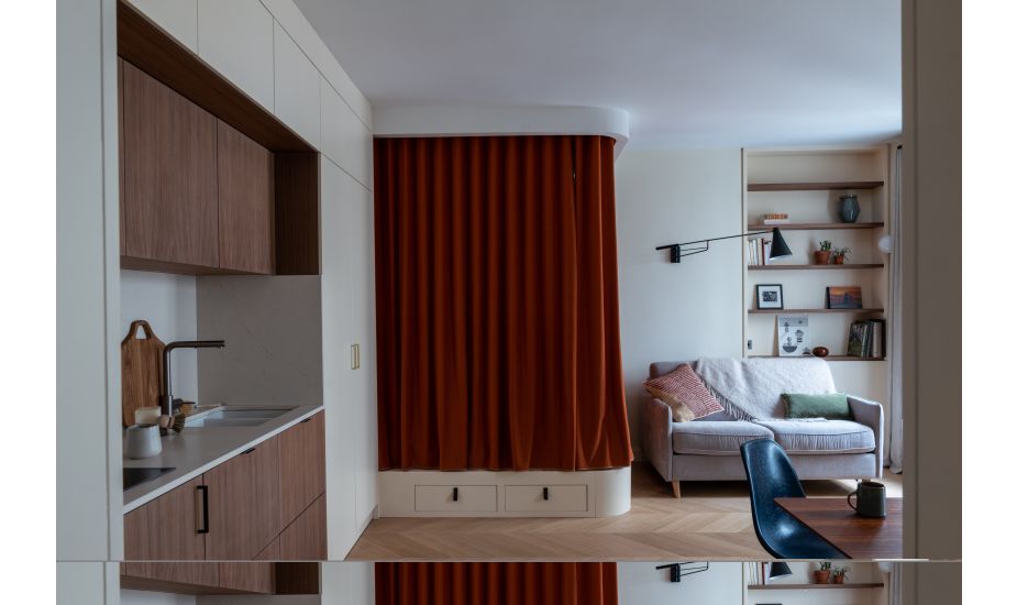 Quand l’architecte Camille Hermand a poussé la porte de deux-pièces, il était morcelé avec couloir, entrée et point d’eau pour la cuisine et la salle de bains. Typiquement un ancien appartement au papier peint désuet qu’auraient pu habiter ces « petites mains » du Bon Marché. Car nous sommes ici rue du Cherche-Midi, dans le 6e arrondissement parisien.