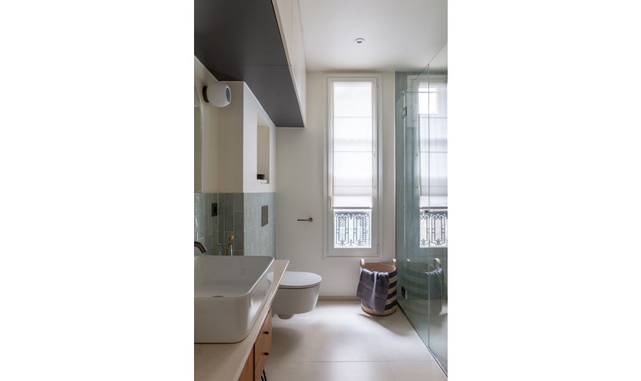 Sous la banquette, du rangement et un radiateur. « Nous aimons mixer les meubles anciens, comme cette table chinée sur Selency et travaillons principalement avec The Conran Shop pour tout le mobilier neuf. Ils sont présents, pertinents et nous offrent toujours un choix exceptionnel ! », explique l’architecte. Suspension, Muuto. « J’aime bien les contraintes ! Tout est millimétré. Le challenge n’est pas dans le haussmannien », s’amuse Camille Hermand, architecte DESA, diplômée de l’École spéciale d’architecture. Qu’il s’agisse de rénovation, d’agrandissement, de surélévation ou de construction, les nombreux chantiers qu’elle a conduits depuis vingt ans ne ressemblent à aucun autre.