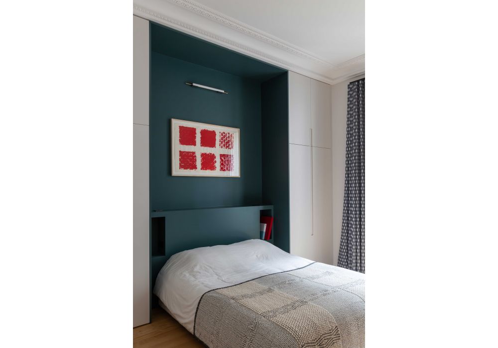 Ce magnifique Haussmannien avait besoin d’entamer une deuxième vie, après le départ des enfants. Il y avait aussi, et surtout, un nouvel accrochage à imaginer pour les œuvres d’art des propriétaires, un nouveau regard à poser. Les éléments d’architecture classiques –plafonds à moulures, doubles portes vitrées, soubassements, vitrail XIX ème- ont été traités le plus sobrement possible. Ils forment un écrin pour chaque œuvre, mise en valeur par un éclairage adapté. Des luminaires et du mobilier design répondent aux tableaux, comme une installation. Dans la partie réception, une galerie d’entrée noire contraste avec un salon et une salle à manger immaculés. Bien distincte, la partie privée accueille en son centre un bureau et une cuisine vitrés, des chambres et des salles de bains aux couleurs douces, lignes pures et élégantes. Photos © Agathe Tissier.