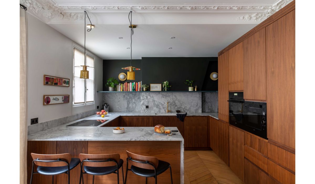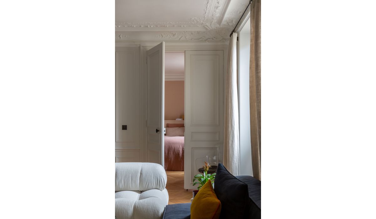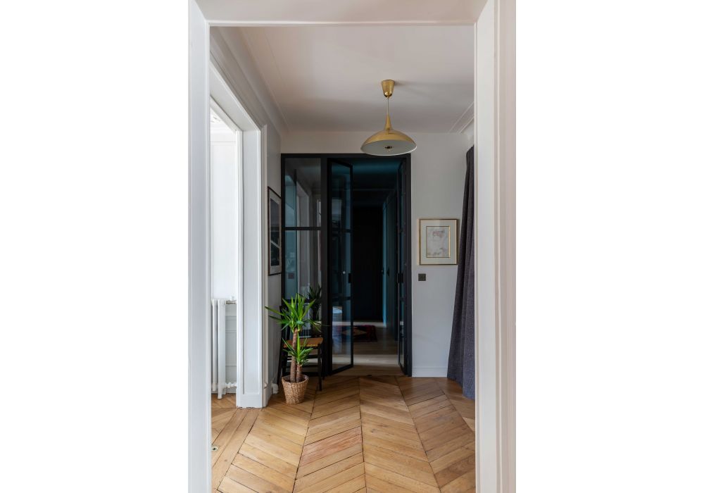 Ce bel appartement ancien avait l’avantage d’éviter le plan classique Haussmannien avec galerie d’entrée, salons en enfilade sur rue et long couloir. Les pièces de vie sur rue et cour communiquent toutes les unes avec les autres, faisant bénéficier l’ensemble d’une double exposition ensoleillée. En repoussant les murs de la salle à manger, Camille Hermand a réussi à y inclure une grande cuisine conviviale. Elle est la pièce maîtresse de l’appartement, avec ses façades en noyer, sa peinture sombre en contraste avec le granit du plan de travail. Ne restait plus qu’à disposer des couleurs pour marquer le territoire de chacun et scander les fonctions : bleu sombre pour l’accès aux chambres des enfants, séparé des pièces de vie blanches par une porte vitrée. L’ambiance est gaie et arty, appuyée par le choix de meubles design tout en rondeur. Photos © Agathe Tissier.