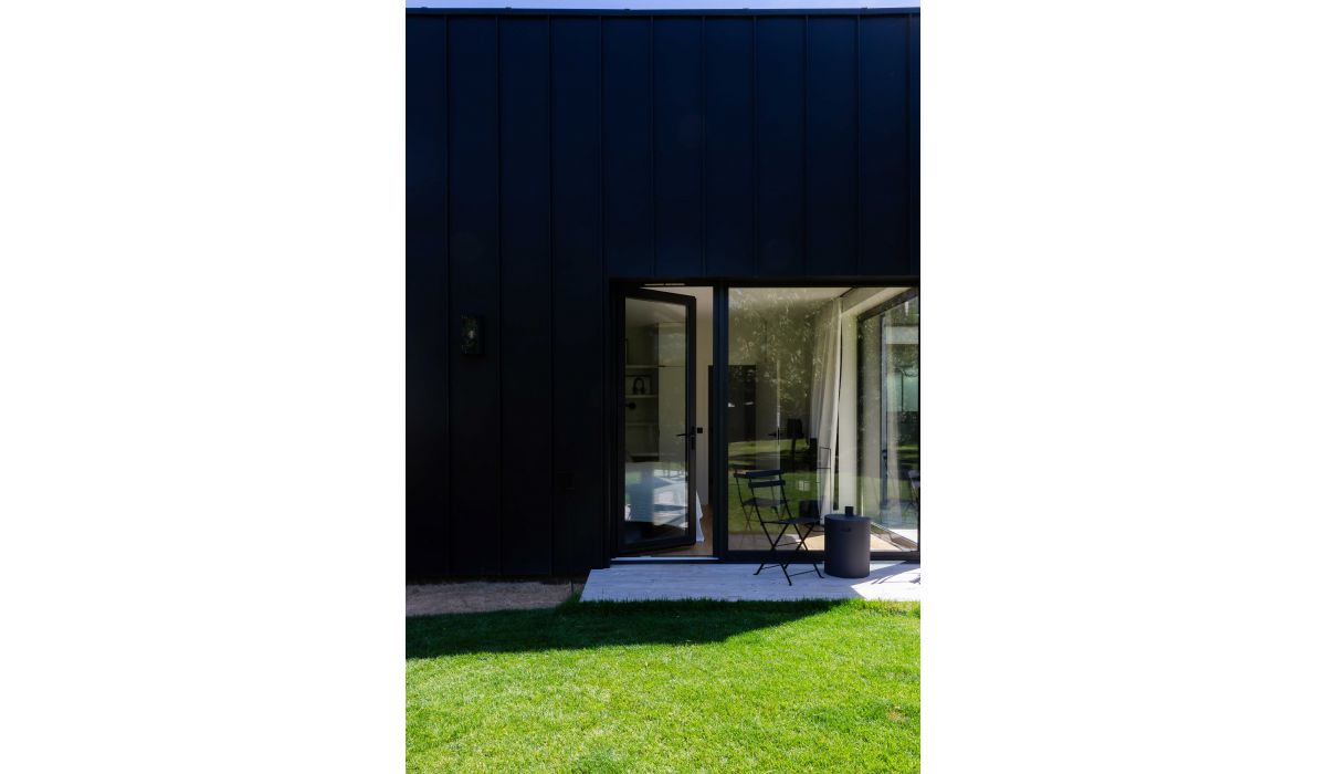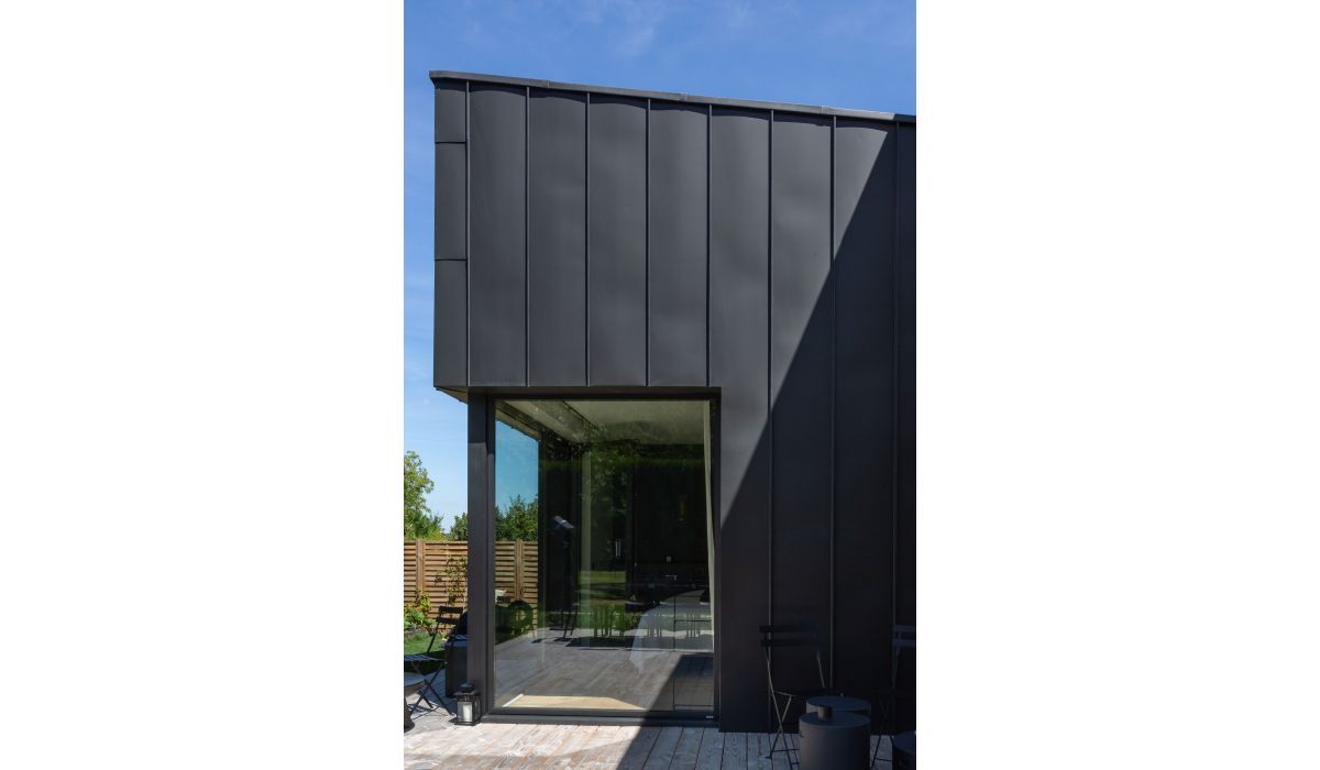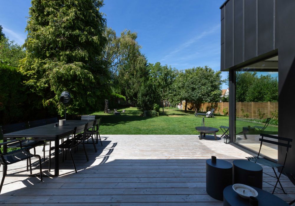 Le projet d'extension a consisté à réunir les deux entités existantes sur le terrain par un jeu de volumes et de toitures. Les grandes baies vitrées offrent des vues cadrées sur le jardin paysagé. La petite maison existante des année 60 a laissé place à de grands espaces de vie, une suite parentale et à trois chambres d'enfants. Un traitement moderne a été apporté aux façades : zinc prépatiné, bardage bois et toiture végétalisée. Photos © Agathe Tissier