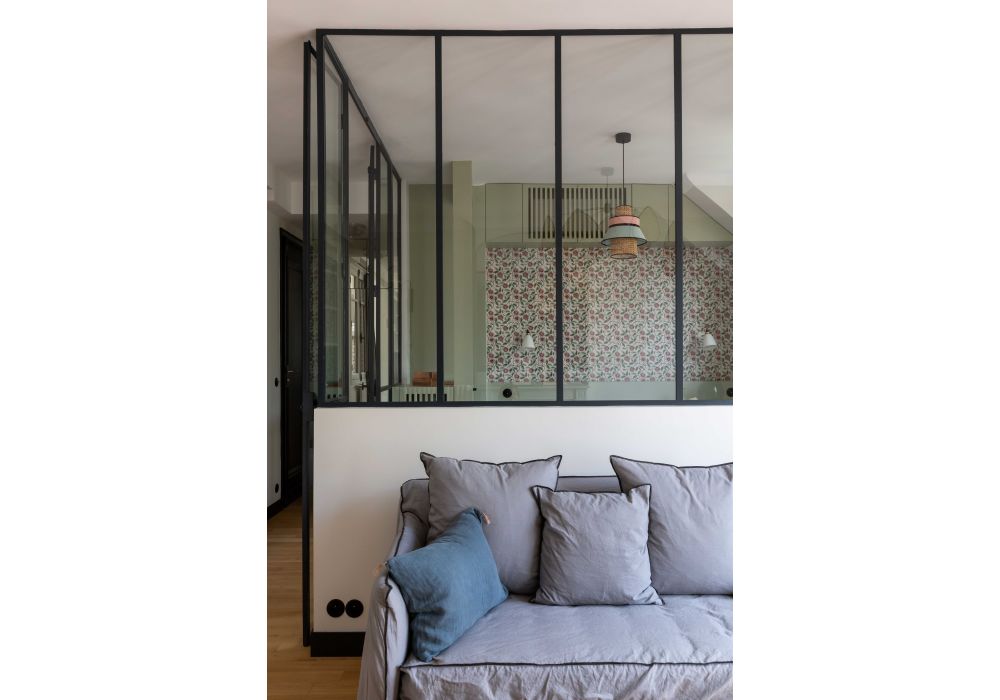Dans une petite surface, chaque centimètre compte. Les propriétaires de cet appartement voulaient en faire leur pied à terre parisien. Camille Hermand a revu le plan pour le transformer en suite d’hôtel. Presque tous les murs ont disparu, libérant la vue sur l’ensemble de l’espace disponible. La chambre est séparée par deux cloisons vitrées, laissant filer le regard. La cuisine est réduite mais fonctionnelle, la place gagnée a servi pour agrandir la salle de bains, créer un toilette séparé et même une buanderie. Dans l’entrée, une place perdue a permis de créer de grands placards. Avec son papier peint fleuri, son enfilade vintage et ses chaises rétro, le style doux et pétillant de ce refuge raffiné est parfaitement assorti au style de l’immeuble, datant des années 50. Photos © Agathe Tissier.