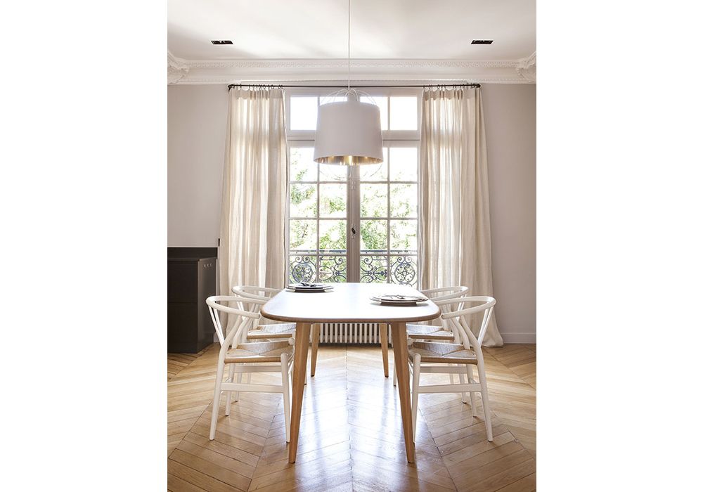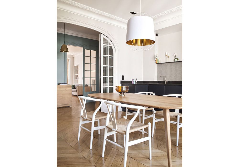 La couleur donne ici le ton et revêt d’une teinte identitaire chaque espace et leur rangements conçus sur-mesure. Une aventure poétique mise en valeur par les doubles portes vitrées dont la forme arrondie inspire naturellement le choix d’un mobilier et de luminaires aux lignes courbes.