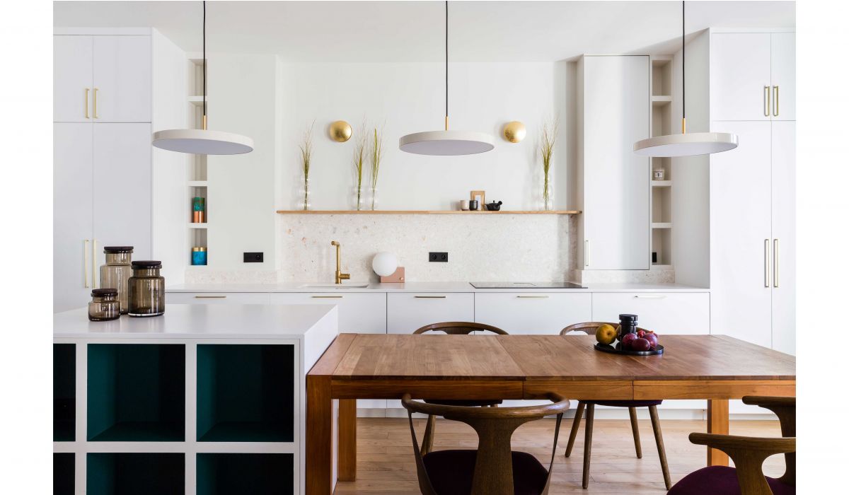 Une rénovation complète était nécessaire dans cet appartement familial dont les derniers travaux dataient des années 60 dans un immeuble ancien. Le plan a été repensé, il s’organise désormais autour d’une grande cheminée contemporaine, dans un salon baigné de lumière, communiquant avec une cuisine ouverte et un bureau. Les touches de bleu et de rose des fauteuils, des peintures et de la bibliothèque sur mesure ponctuent avec élégance cet espace fluide et transparent. © Agathe Tissier.