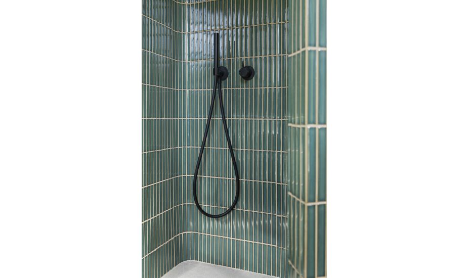 Des étagères maçonnées ont été intégrées dans l’épaisseur des murs pour offrir du rangement sans empiéter sur le volume. Les faïences kitkat, posées verticalement, accompagnent le dessin de la porte et des niches, accentuant la hauteur et les lignes architecturales.